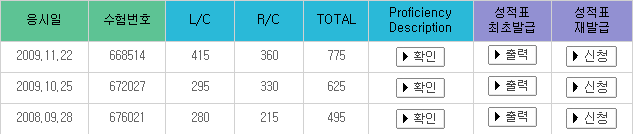 처음것은 작년 토익학원 1달 설렁설렁 다니면서 획득한 점수입니다.