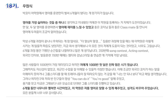 국내 집중 어학연수 18기 우원식 6개월의 변화과정