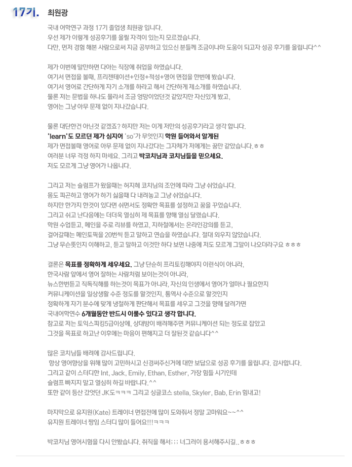 국내 집중 어학연수 17기 최원광 6개월의 변화과정