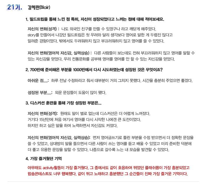 국내 집중 어학연수 21기 김혜란 6개월의 변화과정