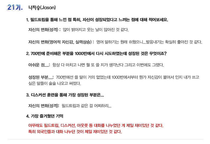 국내 집중 어학연수 21기 나지승 6개월의 변화과정