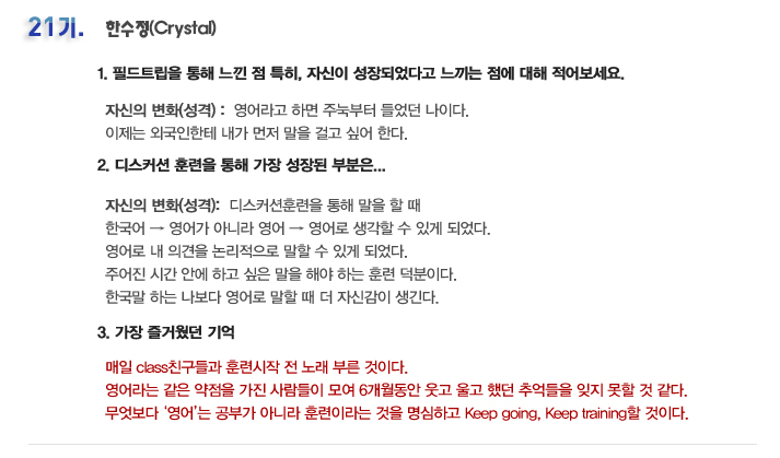 단기 집중 국내 어학연수 21기 한수정 6개월의 변화과정