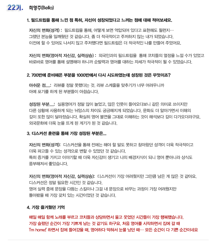 단기 집중 국내 어학연수 22기 이소라 6개월의 변화과정