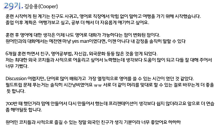 표현력이 풍부해져 내 감정을 솔직하게 다 말할 수 있게 되었습니다. 박코치 어학원은 졸업을 하게 됐지만, 앞으로도 꾸준히 영어 훈련을 스스로 하여 프레젠테이션도 잘 할 수 있게 더 영어 실력을 끌어 올릴 계획입니다.